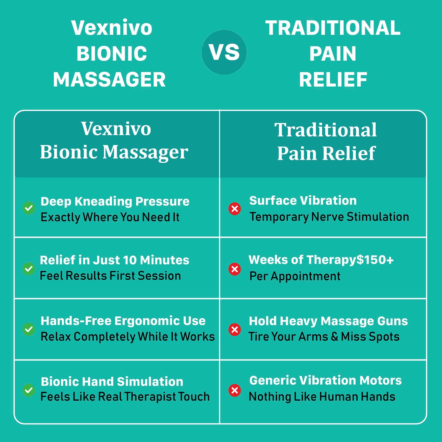 Vexnivo™, the revolutionary 3-in-1 Trinity Relief System. Combining bionic hand kneading, therapeutic heat zones, and 4D rotation technology, it redefines what's possible in at-home chronic pain treatment.