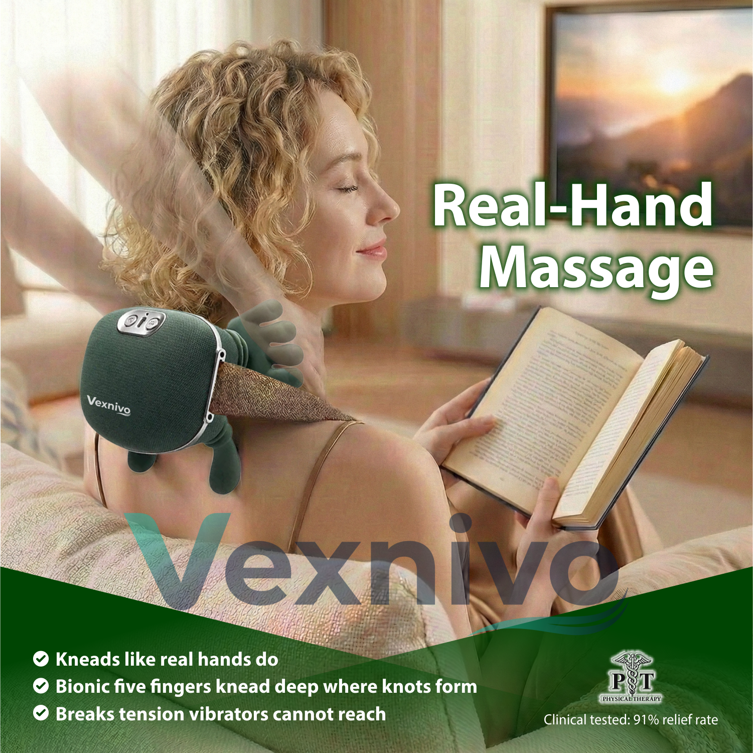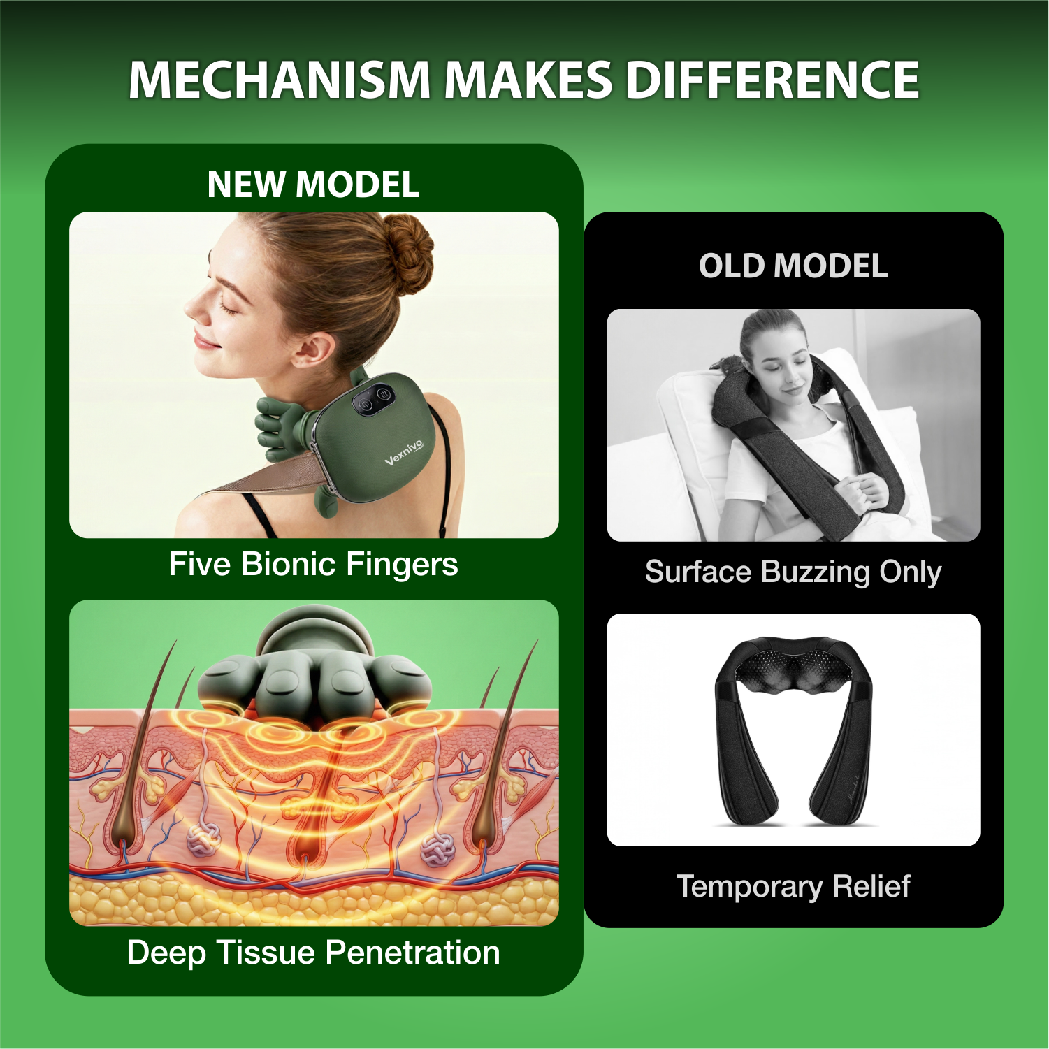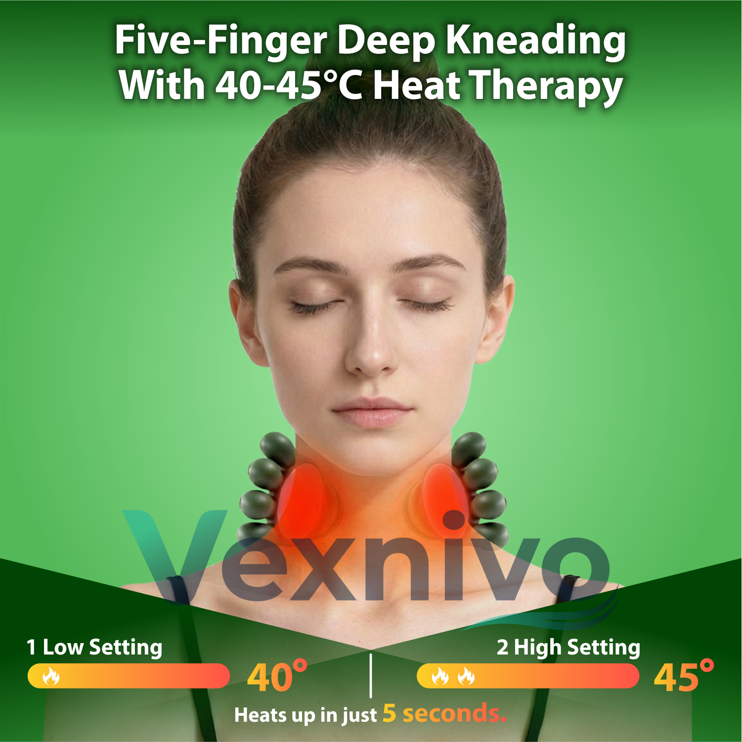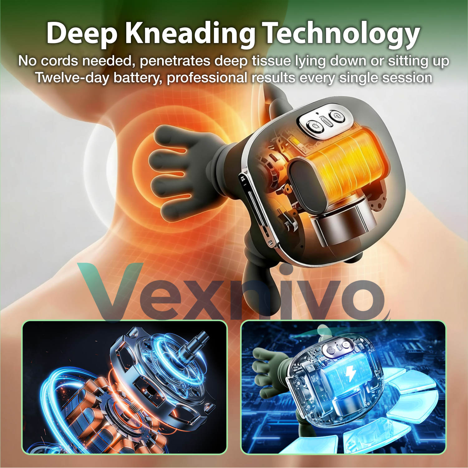 Vexnivo uses Bionic Five-Finger Kneading Technology – the same deep, sustained pressure professional massage therapists use to physically break up knots.