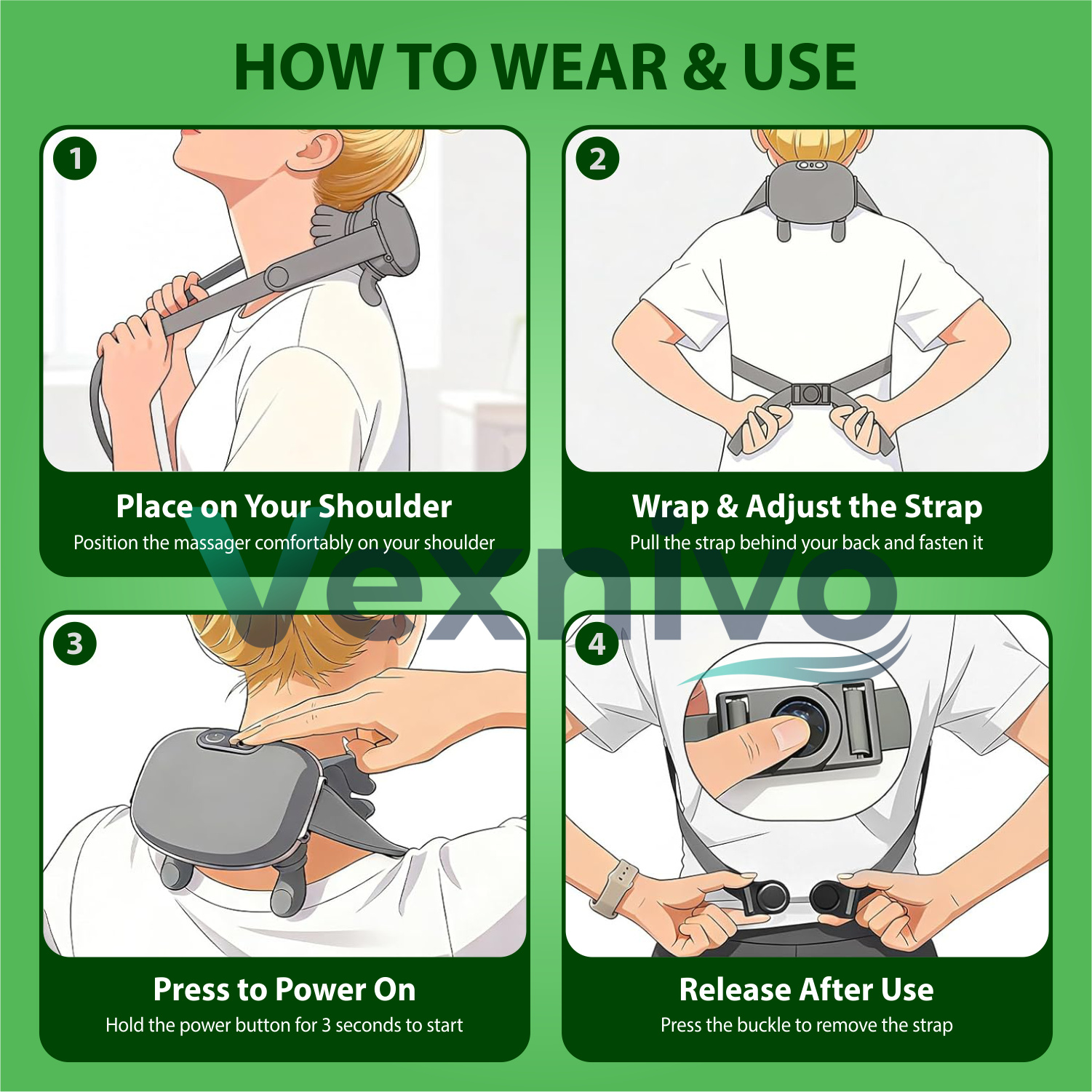 Vexnivo goes beyond the neck and shoulders – use it on your back, waist, thighs, or calves to ease tension anywhere.