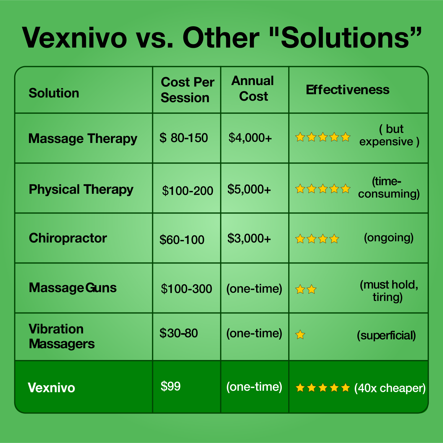 One Vexnivo = 50+ Massage Therapy Sessions